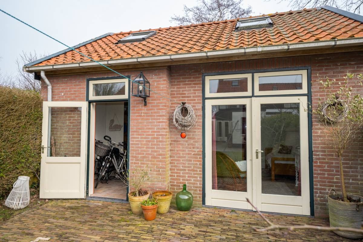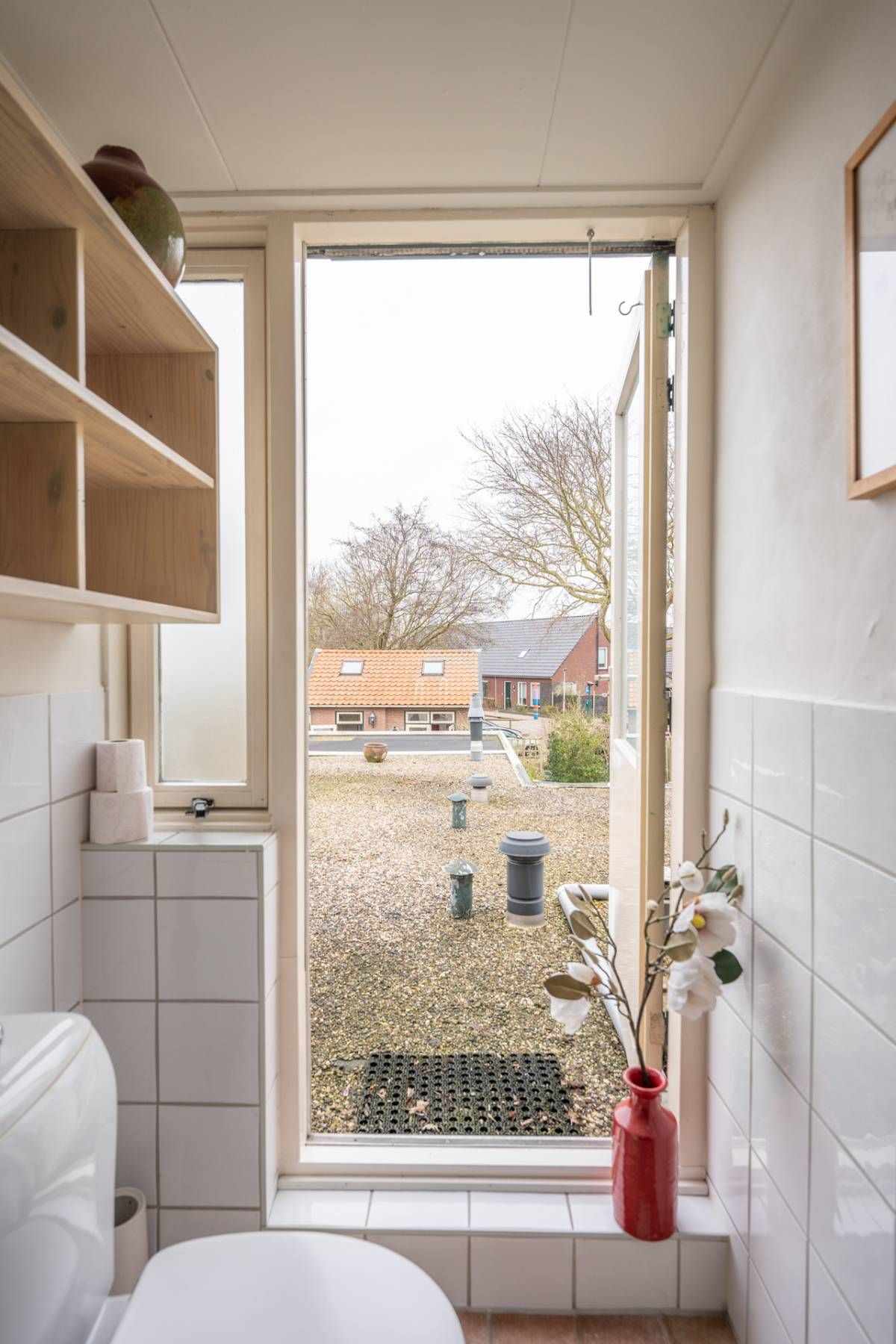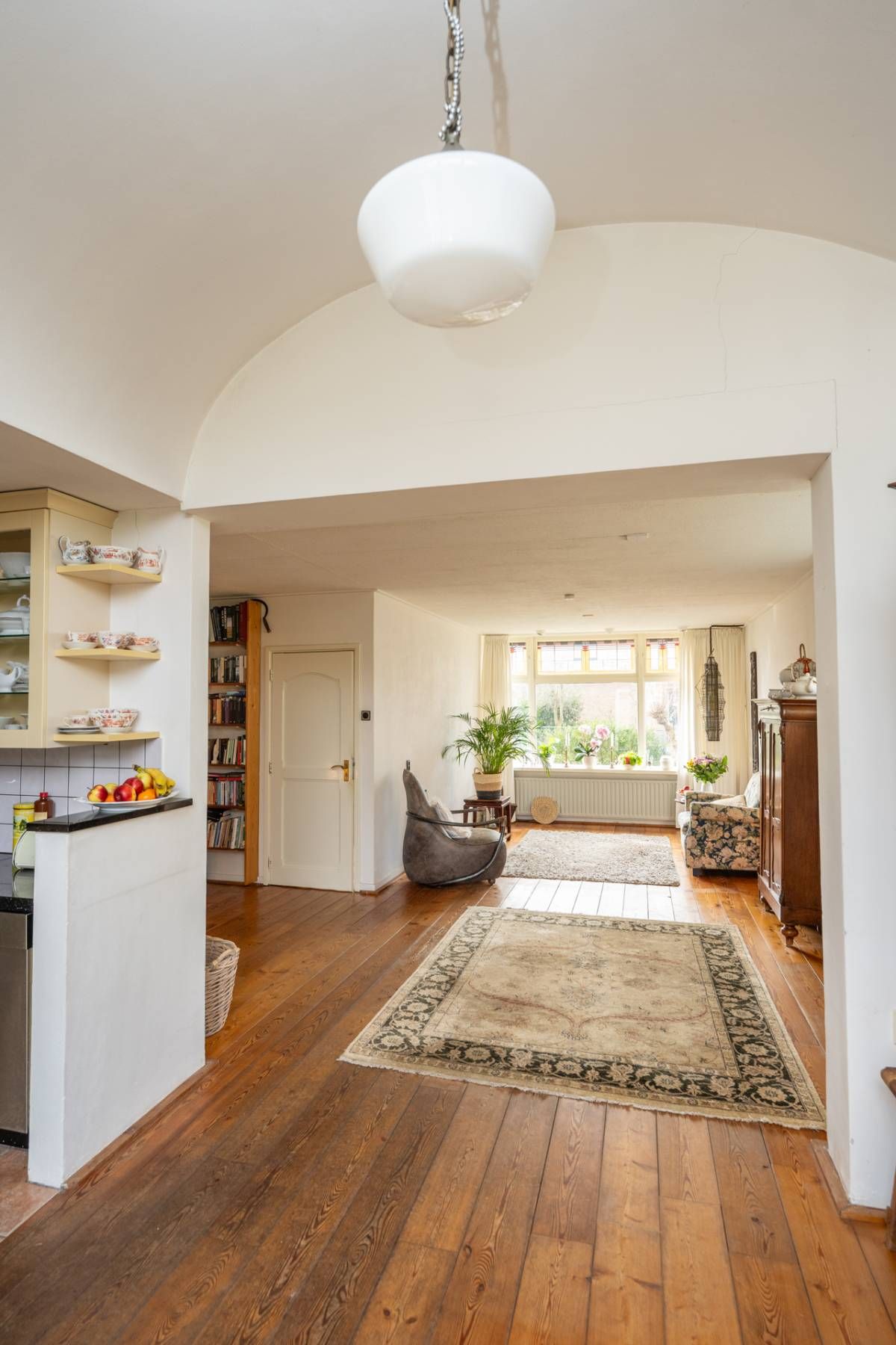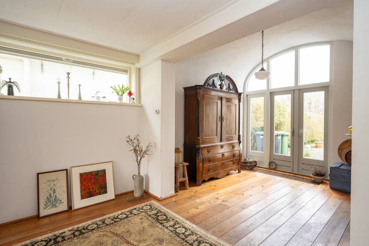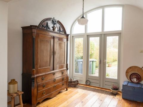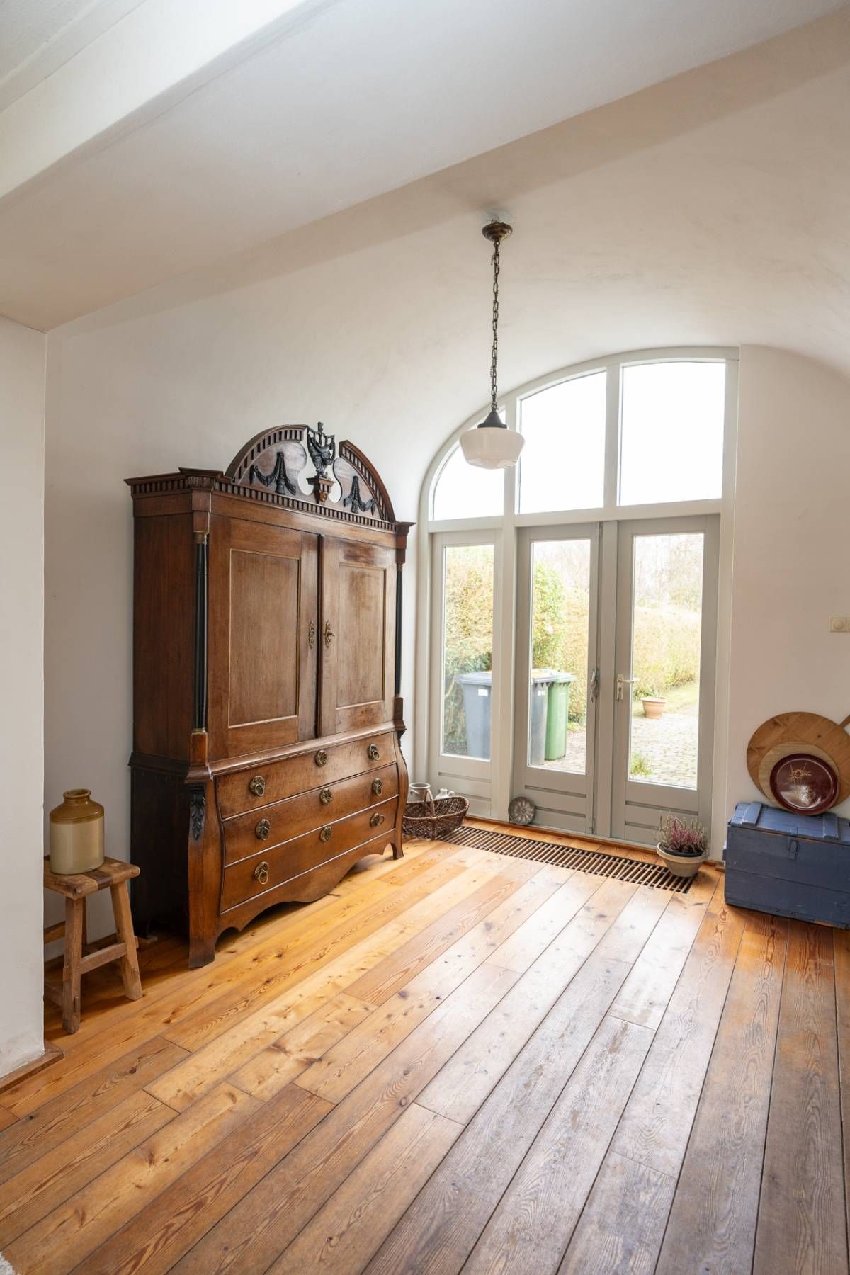 Boven de openslaande deuren aan de achterzijde bevindt zich een speelse (ronde) raampartij.