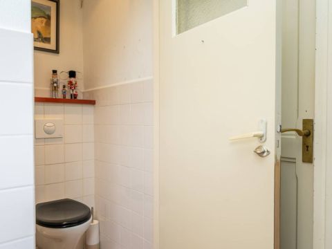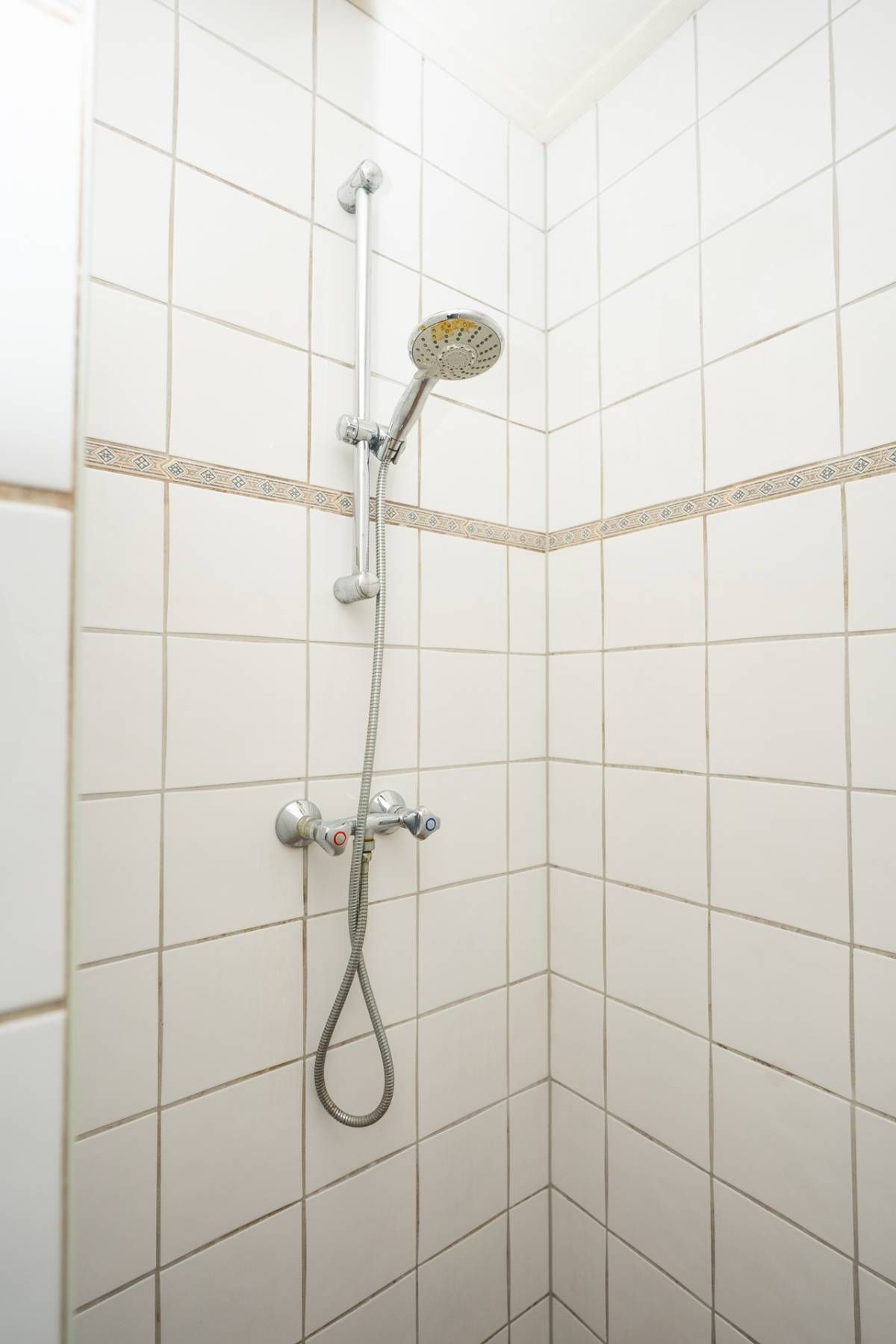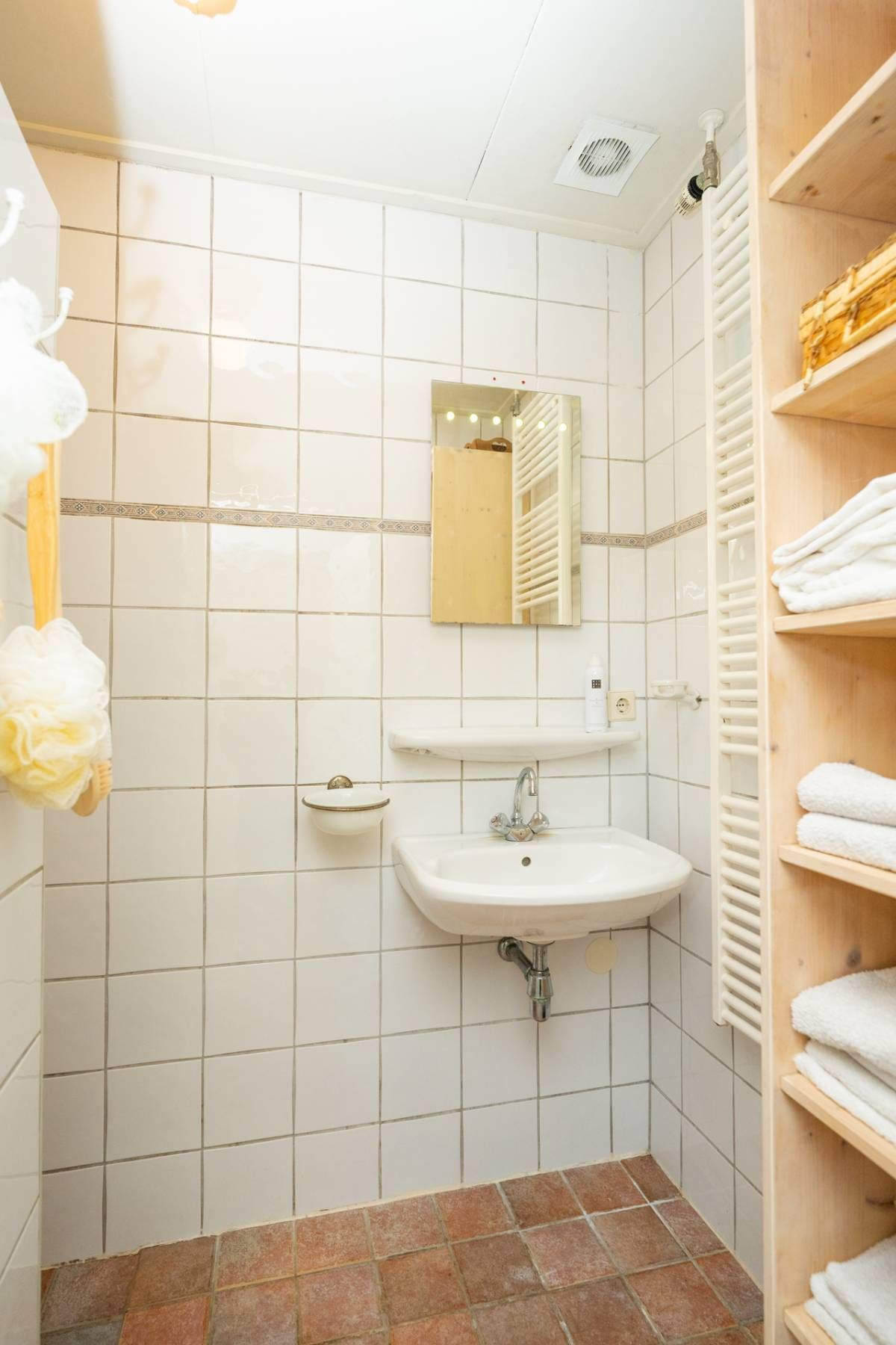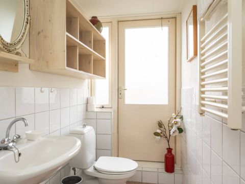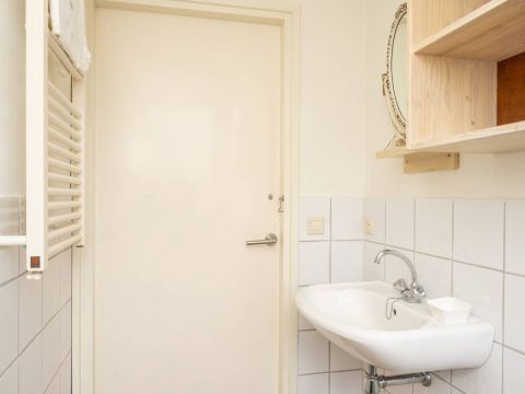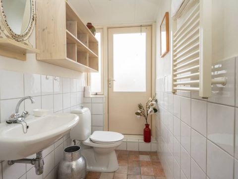 Via de keuken kom je in de hal met separaat toilet, een eenvoudige nette badcel welke volledig is betegeld en voorzien van douche en wastafel.