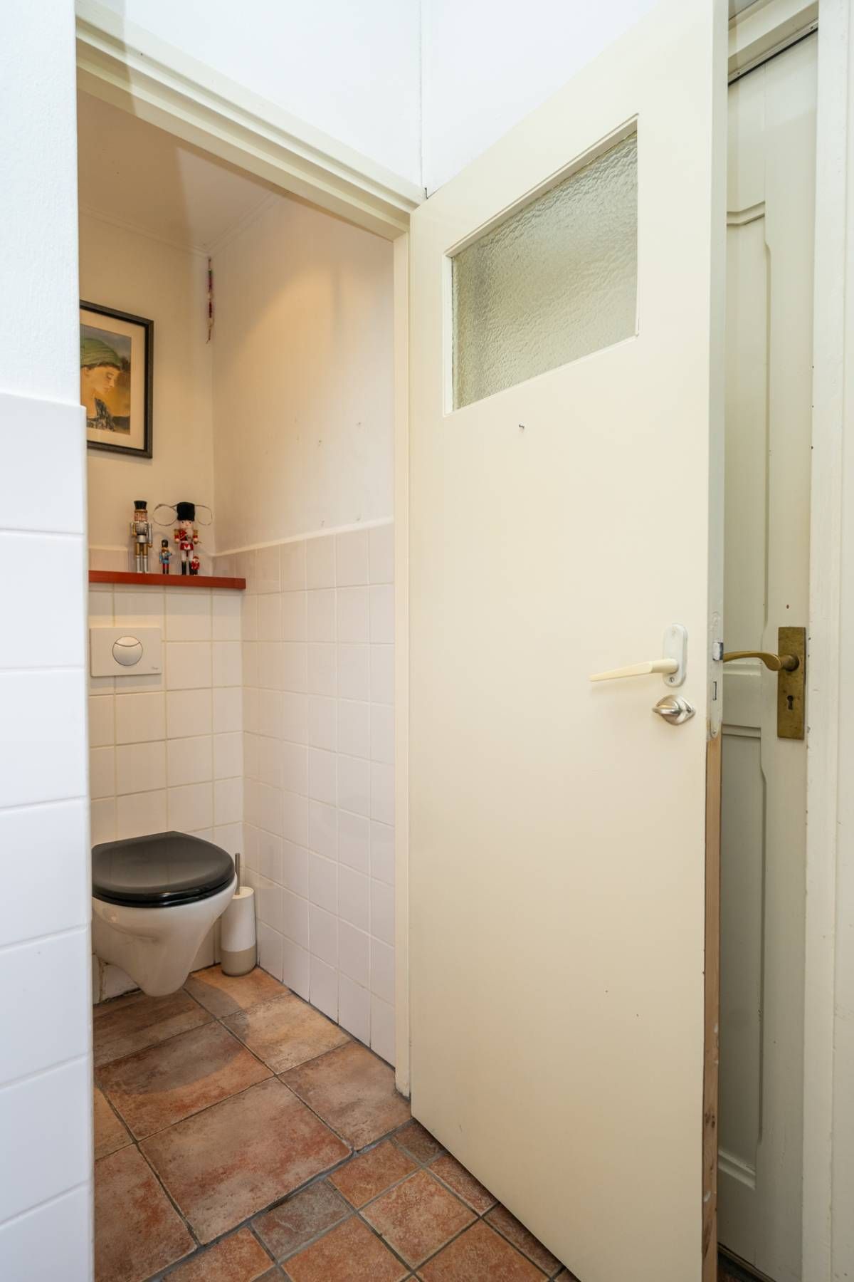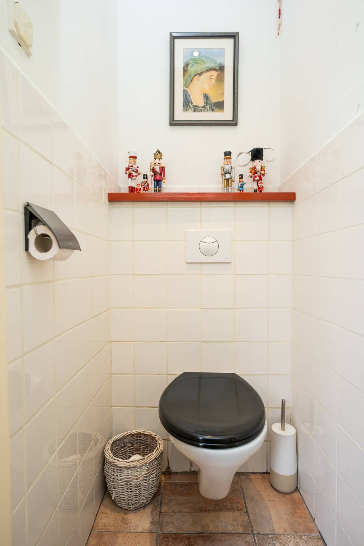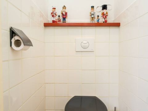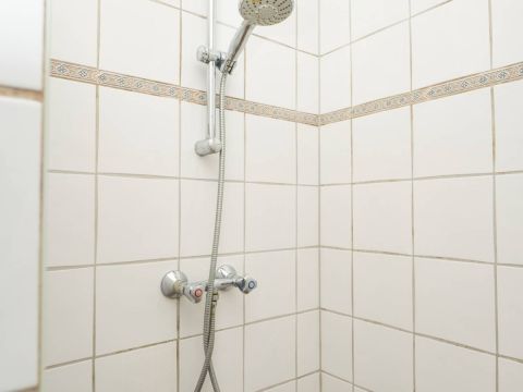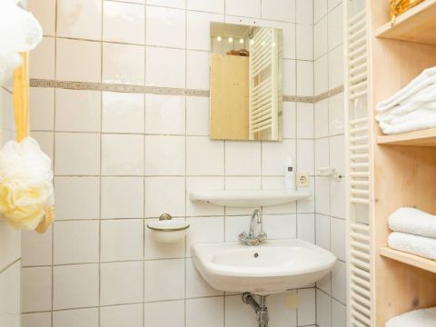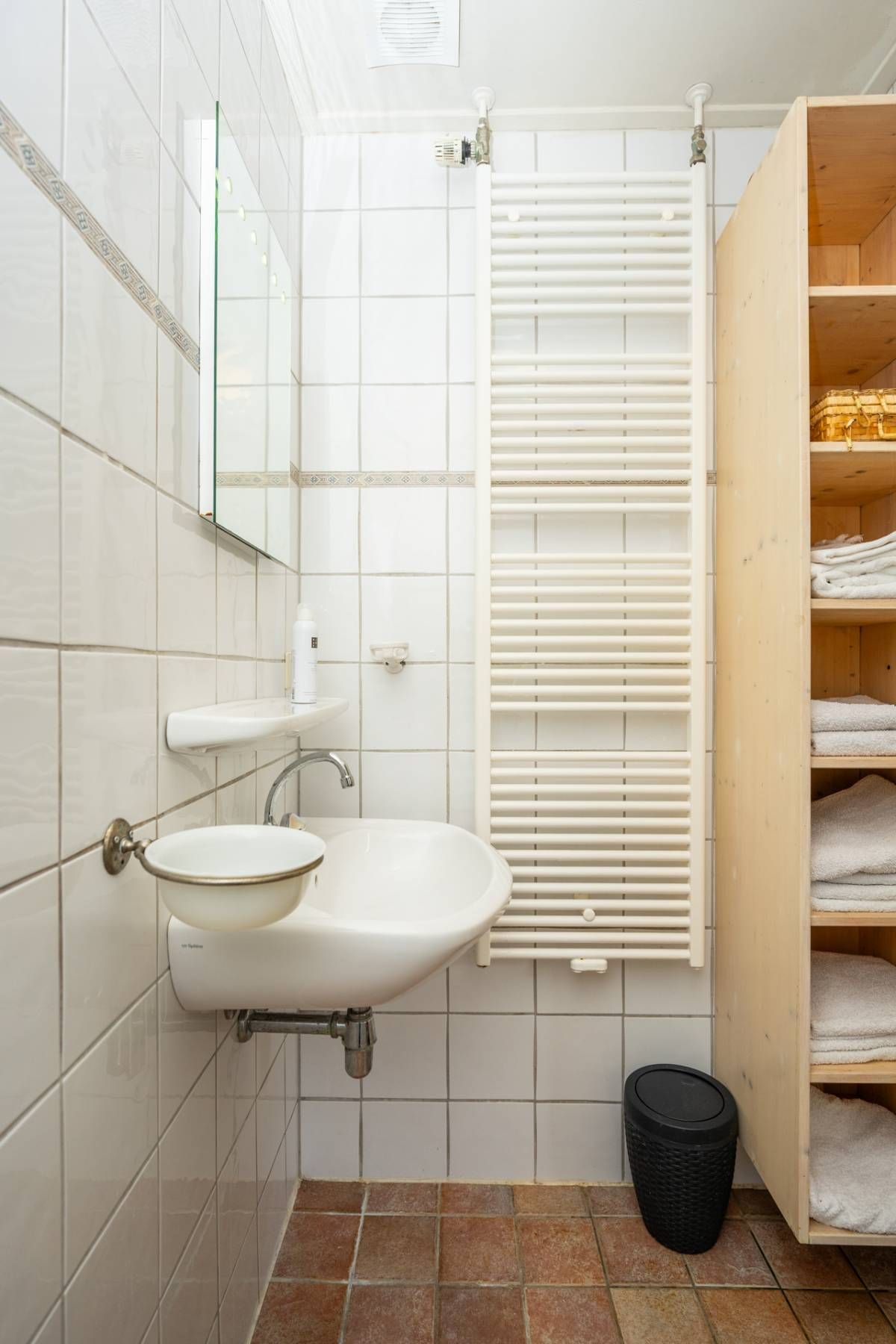 Via de keuken kom je in de hal met separaat toilet, een eenvoudige nette badcel welke volledig is betegeld en voorzien van douche en wastafel.