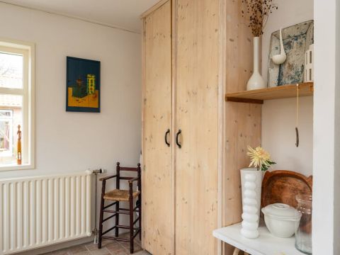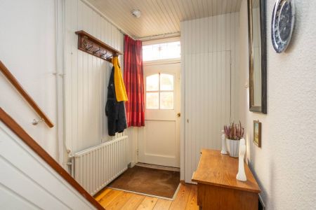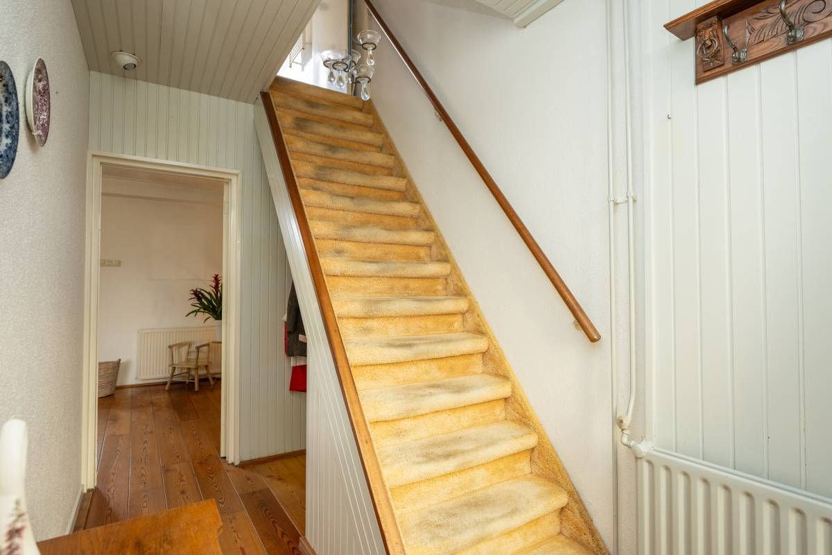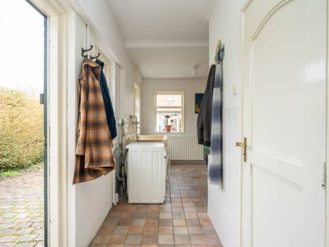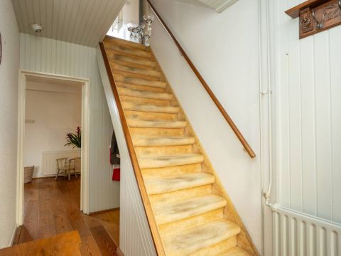 Indeling | In de nette hal met trapopgang bevindt zich de meterkast. Op de vloer ligt een warmkleurige eikenvloer welke is doorgetrokken over de gehele benedenverdieping (met uitzondering van de bijkeuken). Onder de trap is een garderobe gesitueerd.