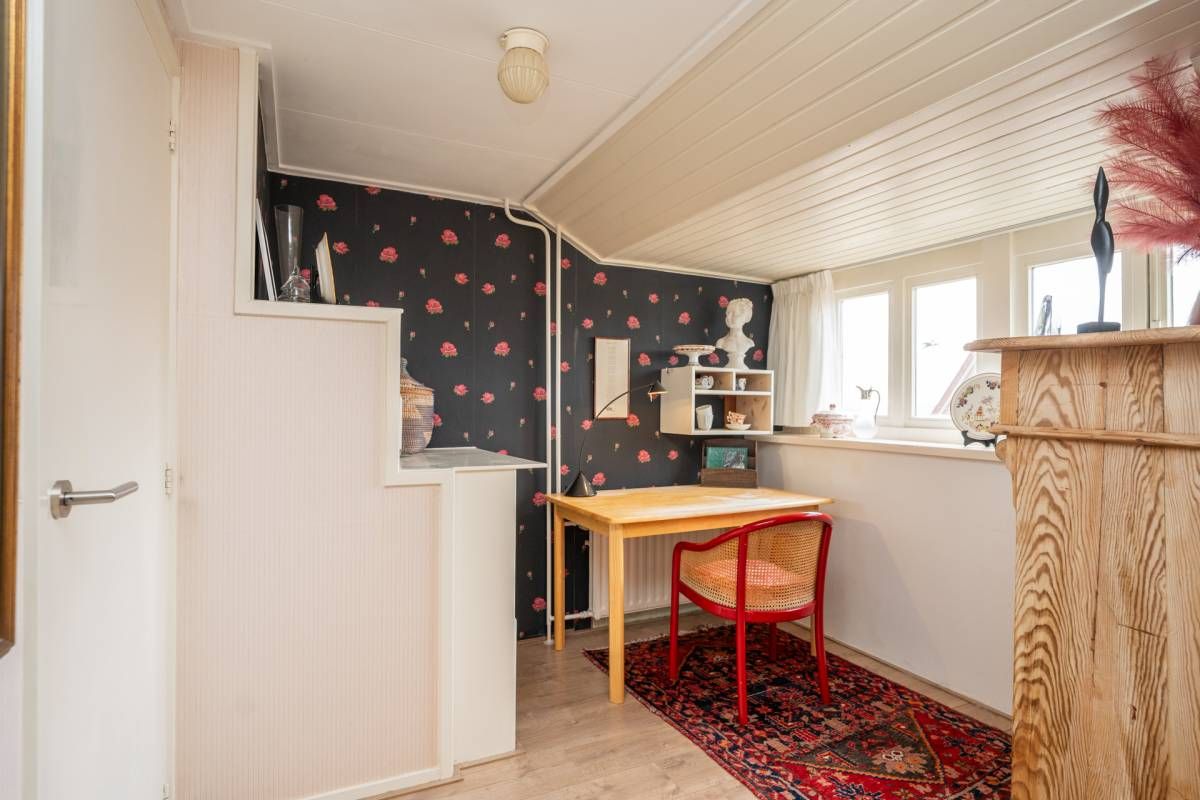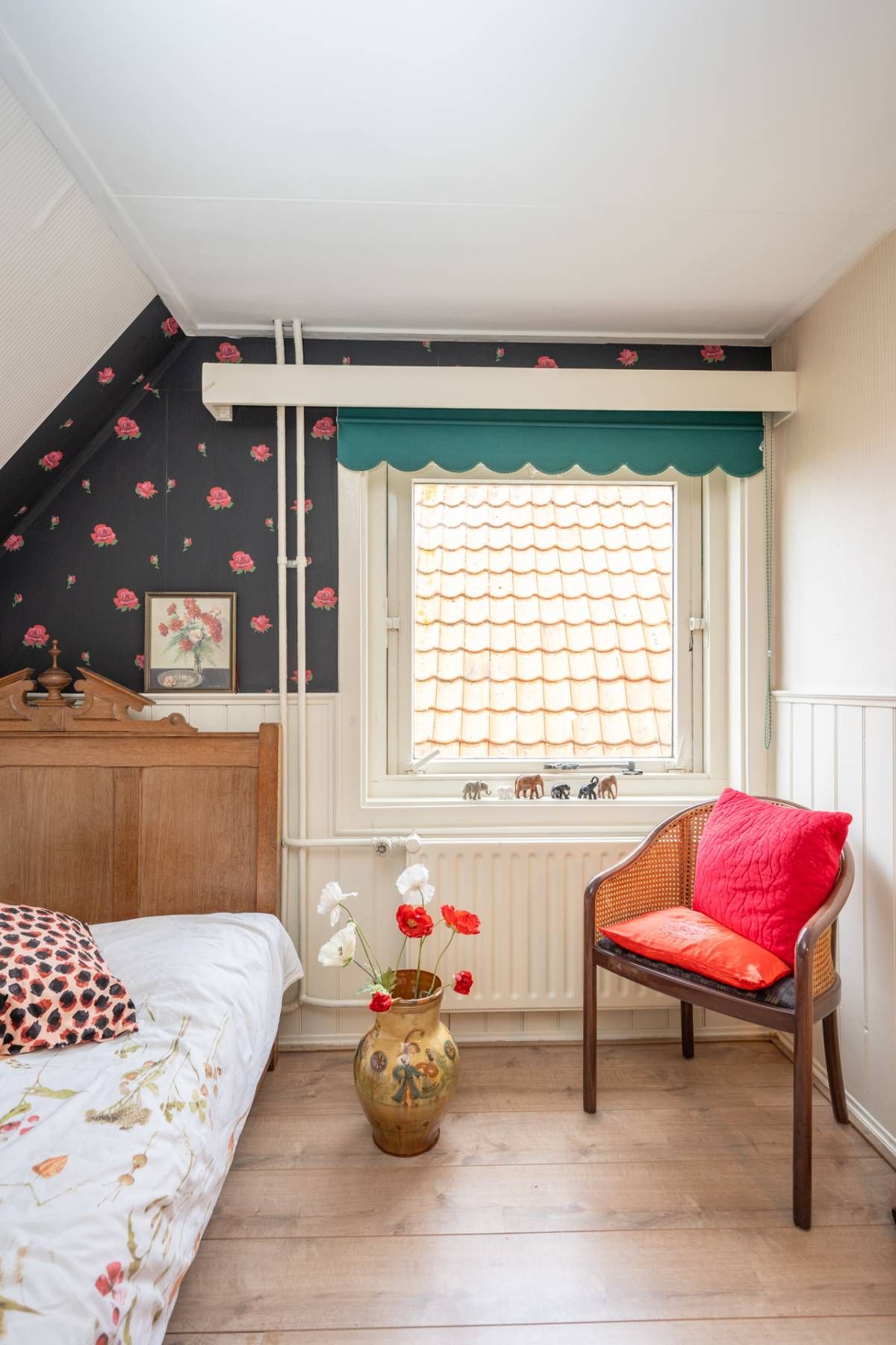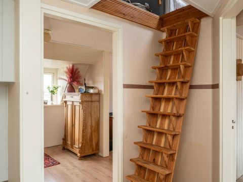 Verdieping | Op de eerste verdieping is de overloop met toegang tot 2 ruime slaapkamers, toilet (met toegang tot het dakterras) en een houten trap naar de zolder.