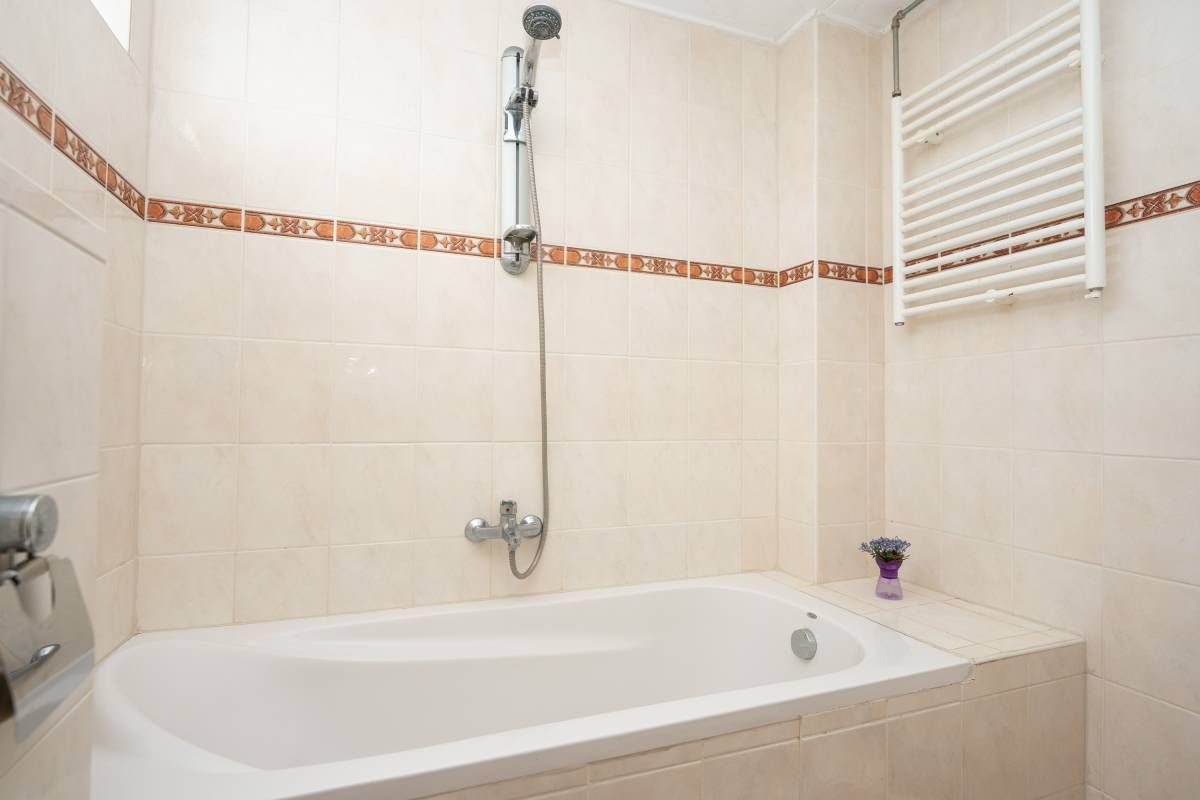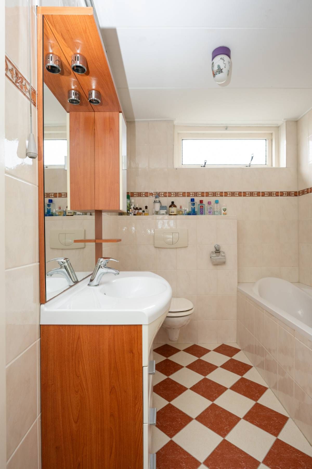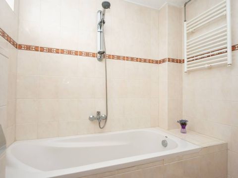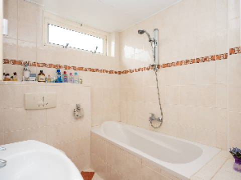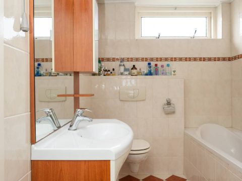 De badkamer is voorzien van een ligbad met douche, toilet en wastafelmeubel.